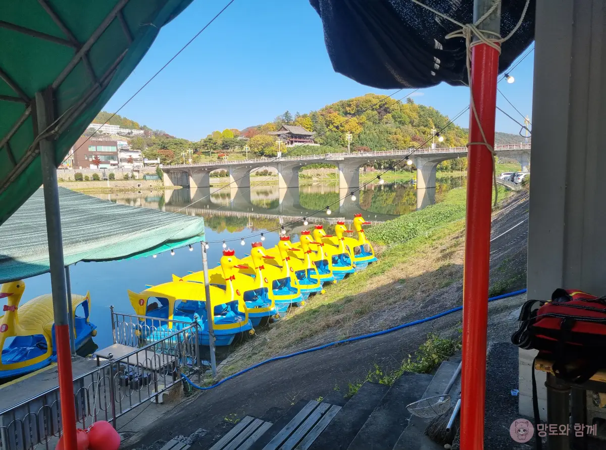 안전을 위해 밀양강 가장자리나 멀리는 갈 수 없기 때문에 오리배로 위치를 설정해 두었어요. 그 오리배를 넘어가지 않으면 된답니다.