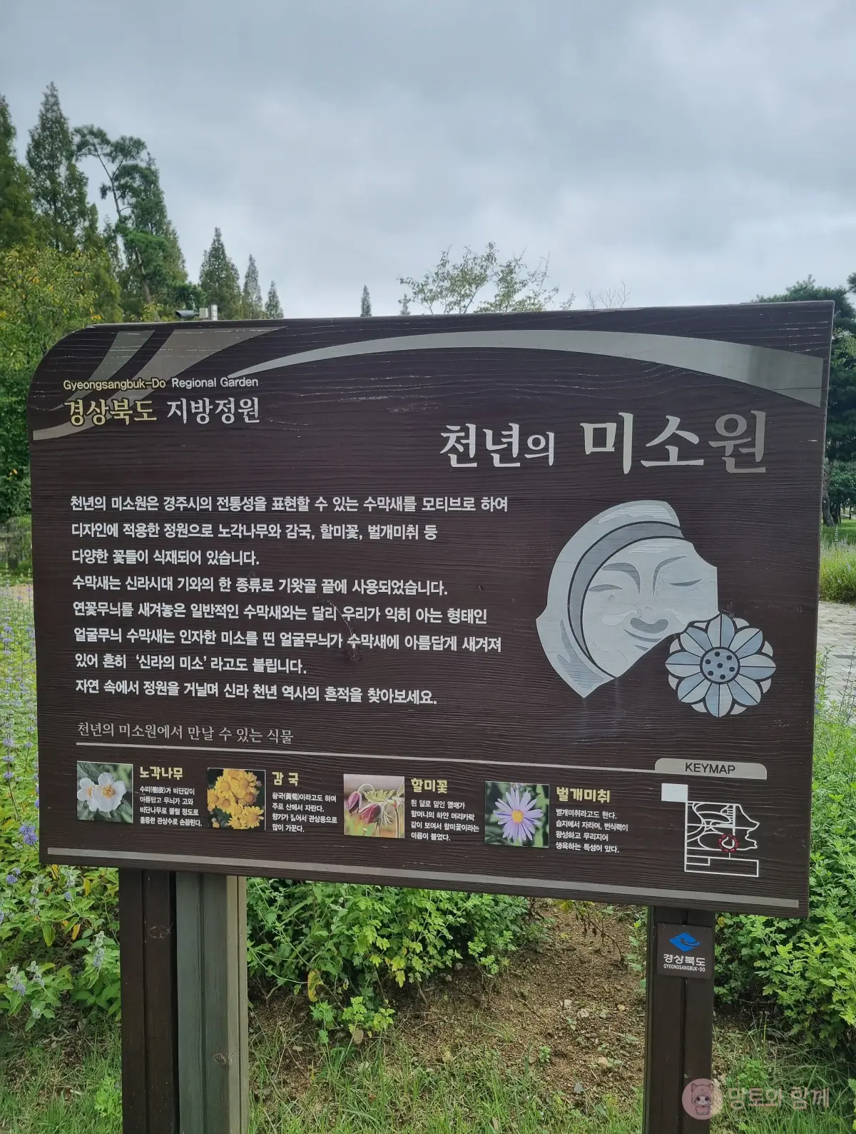 천년의 미소원은 미소 띤 얼굴 조형물이 실제로 있어요. 수막새를 모티브로 디자인에 적용한 정원이라 해요.