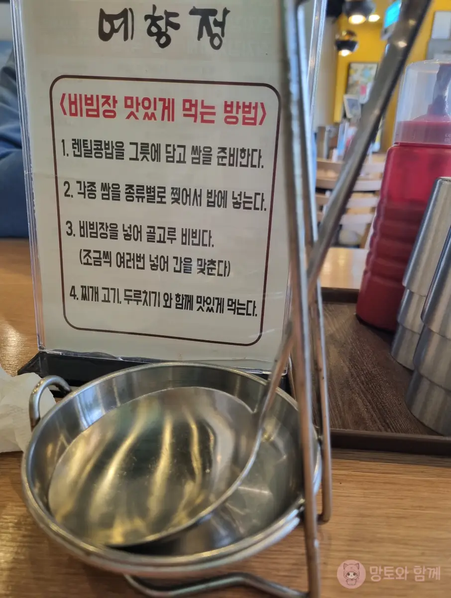 기본찬도 4가지로 깔끔하게 나오고요, 비빔장 맛있게 먹는 방법도 안내되어 있더라고요. 덜어 먹을 수 있는 국자도 귀엽게 세워져 있어요.